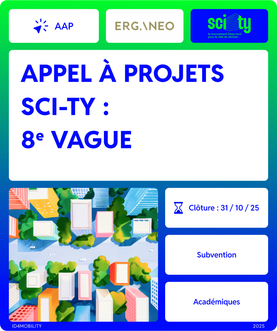 Le programme d'accompagnement Sci-ty, la Deep tech pour les Villes et Mobilités de demain, vise à soutenir de multiples projets d’innovation pour favoriser leur transfert vers le monde socio- économique en créant une communauté d’experts et d’innovateurs au niveau national et à l’échelle des territoires (experts, scientifiques, collectivités et habitants, acteurs socio-économiques).